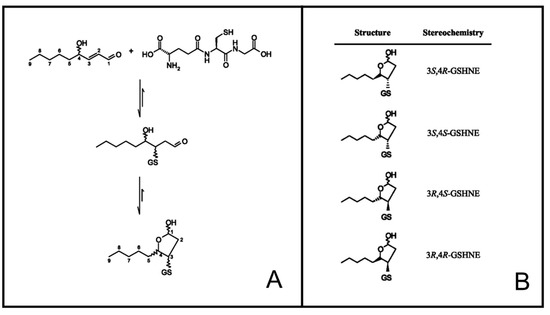 Reaction of 4-hydroxy-2-nonenal (HNE) with glutathione (GSH). (A) The reaction of GSH adduction on C3 of HNE followed by intramolecular cyclization to generate the corresponding hemiacetal species. (B) The structures of different 3-glutathionyl-4-hydroxynonane (GSHNE) diastereoisomers generated upon adduction.
