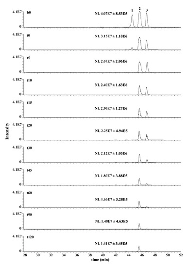 Nano-LC-ESI-LIT-MS analysis of the reaction mixture containing hAKR1B1, GSHNE and NADPH. Reported are the extracted ion currents (EIC) relative to GSHNE (i.e., m/z 464.25), which were measured for the 10 sampling times (from t0 to t120) of the reaction mixture (see Section 2.6) and for the reference reaction mixture b0 without hAKR1B1. Sample t0 refers to a sample withdrawn from the reaction mixture just after the addition of hAKR1B1. For each sampling time, normalized intensity levels (NLs) are reported as the mean values ± SD determined over five chromatographic runs; NL refers to the largest peak of the GSHNE triplets 1, 2 and 3.