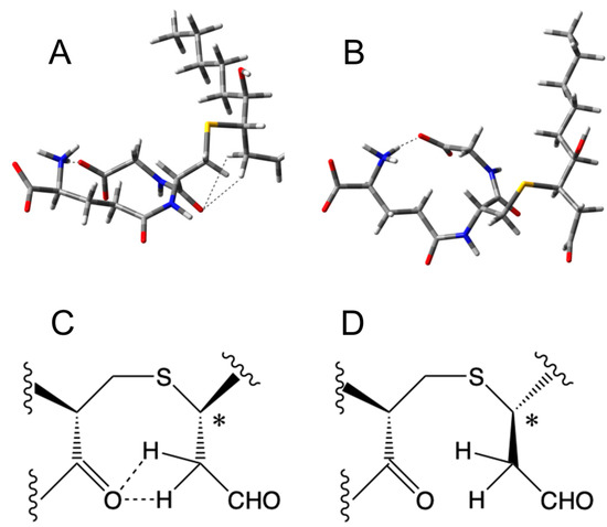 A careful inspection of the open GSHNE structures showed that significant interactions between the acidic protons of the C2 acidic protons of the nonanal moieties and the amidic groups of the glutathionyl portion were observed in the cases of 3S,4R-GSHNE (Figure 4A,C) and 3R,4S-GSHNE (data not shown). The stereochemistry did not allow this kind of interaction in the case of both 3R,4R-GSHNE (Figure 4B,D) and 3S,4S-GSHNE (data not shown). In all closed structures, this interaction was not possible for the different spatial arrangements of diastereoisomers and for the very low acidities of the protons mentioned above when the adjacent carbon was hemiacetalic.