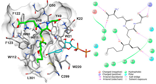 In order to identify the potential binding mode of the open structures of different GSHNE diastereoisomers, their possible interaction with hAKR1B1 was evaluated by means of docking and MD simulations. Figure 5 shows the results obtained for 3S,4R-GSHNE. In particular, this diastereoisomer showed a T-shaped disposition, with its glutathione moiety perpendicular to the corresponding hydroxynonanal portion. The glutathionyl mojety showed H-bonds with the nitrogen of the polypeptide bond linking F122 and F123, as well as ionic interactions with K22, whereas the alkyl chain of the nonanal portion was inserted into a lipophilic pocket delimited by W112, F123, W220 and L301. The 4-hydroxyl group of 3S,4R-GSHNE showed a stable H-bond with the indole ring of W112, and the aldehydic portion of the adduct was inserted into the catalytic region of the hAKR1B1 binding site where it was also hydrogen-bonded to H111.