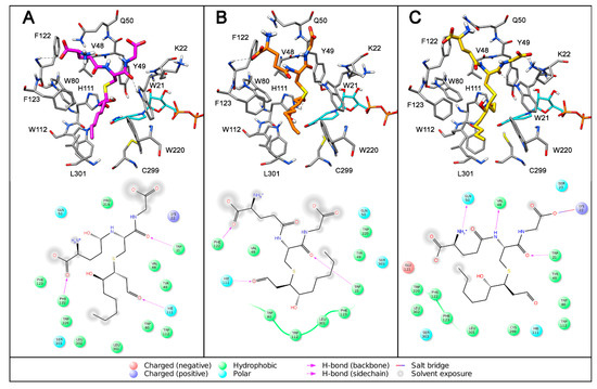 Interaction of hAR1B1 with different GSHNE diastereoisomers. The minimized average structures of 3R,4R-GSHNE (A), 3R,4S-GSHNE (B) and 3S,4S-GSHNE (C) docked into the hAKR1B1 active site are reported. All interactions between the GSHNE and enzyme residues are shown.