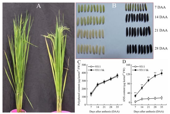 Comparison of plant phenotypes between bk mutant (9311bk) and its wild type (9311) at heading stage. (A) Plant growth phenotype, left: 9311 and right: 9311bk. (B) Grain appearance (the samples harvested at 7 days interval after anthesis), left: 9311 and right: 9311bk. (C) Temporal pattern of polyphenol content and (D) Temporal pattern of anthocyanin (ANS) content during kernel development. DAA indicates the days after anthesis. Vertical bars represent standard errors (n = 3). The asterisks represent significant differences (** p < 0.01).