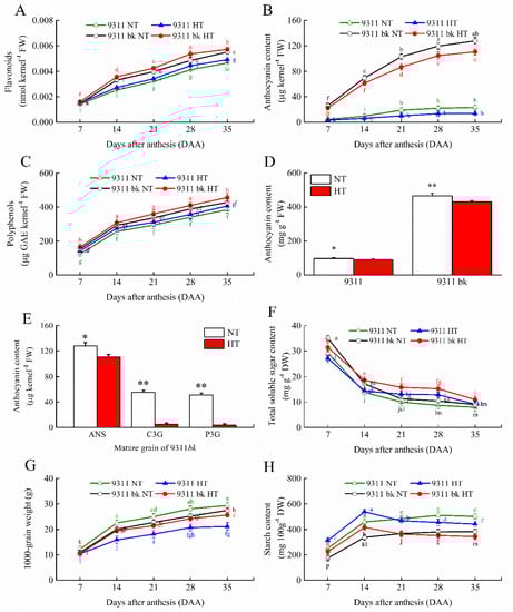Effect of high temperature on pigment accumulation in the rice kernel. (A) Temporal pattern of flavonoid content in kernel of 9311 and 9311bk, (B) temporal pattern of anthocyanin content in kernel of 9311 and 9311bk, (C) temporal pattern of polyphenol content in kernel of 9311 and 9311bk, (D) anthocyanin content in mature grains of 9311 and 9311bk, (E) anthocyanin (ANS), cyanidin-3-O-glucoside (C3G) and peonidin-3-O-glucoside (P3G) content in mature grain of 9311bk measured by HPLC, (F) temporal pattern of total soluble sugar content in kernel of 9311 and 9311bk, (G) temporal pattern of 1000-grain weight of 9311 and 9311bk and (H) temporal pattern of starch content in kernel of 9311 and 9311bk after anthesis. Vertical bars represent standard errors (n = 3). Different letters represent significant differences (p < 0.05) and the asterisks also represent significant differences (* p < 0.05 and ** p < 0.01). DAA stands for days after anthesis.
