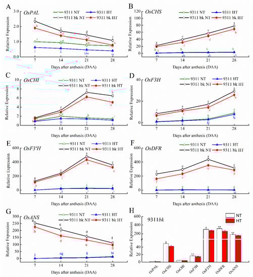 Effect of the high temperature on the expression of anthocyanin biosynthesis genes and their temporal patterns in 9311bk and WT kernels. (A–G) The time course of OsPAL, OsCHS, OsCHI, OsF3H, OsF3’H, OsANS and OsDFR expression during kernel development and (H) comparison of relative expression of genes involved in anthocyanin biosynthesis in developing kernel of 9311bk at after anthesis. Vertical bars represent standard errors (n = 3). Different letters represent significant differences (p < 0.05) and the asterisks also represent significant differences (* p < 0.05 and ** p < 0.01). DAA stands for days after anthesis.