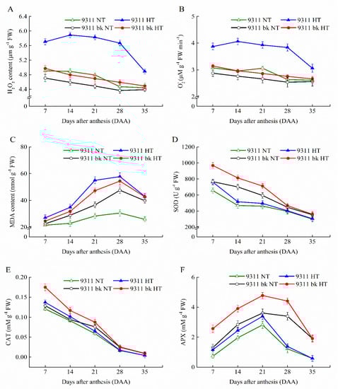 Effect of high temperature on reactive oxygen species (ROS) content and antioxidant enzyme activity in 9311 and 9311bk during kernel filling process towards maturity. (A) H2O2 content, (B) O2− content, (C) MDA content, (D) SOD activity, (E) CAT activity and (F) APX activity. Vertical bars represent standard errors (n = 3). DAA stands for days after anthesis.