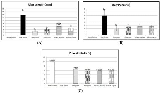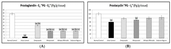 APA StyleZaghlool, S. S., Abo-Seif, A. A., Rabeh, M. A., Abdelmohsen, U. R., & Messiha, B. A. S. (2019). Gastro-Protective and Anti-Oxidant Potential of Althaea officinalis and Solanum nigrum on Pyloric Ligation/Indomethacin-Induced Ulceration in Rats. Antioxidants, 8(11), 512. https://doi.org/10.3390/antiox8110512