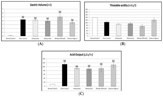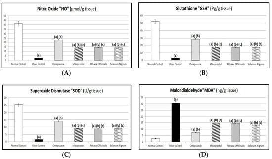 Zaghlool, S.S.; Abo-Seif, A.A.; Rabeh, M.A.; Abdelmohsen, U.R.; Messiha, B.A.S. Gastro-Protective and Anti-Oxidant Potential of Althaea officinalis and Solanum nigrum on Pyloric Ligation/Indomethacin-Induced Ulceration in Rats. Antioxidants 2019, 8, 512. https://doi.org/10.3390/antiox8110512