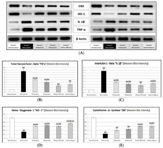 2.14. Immunological Markers (Gastric Mucosal TNF-α and IL-1β Contents and CBS and HO-1 Activities) Estimated by Western Blot Analysis