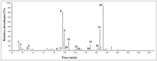 Chromatographic representation of Ta 12 population at 280 nm. Numbers in the figure correspond to the UHPLC-DAD-ESI-MSn peaks described in Table 3.