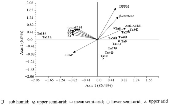 Plot of the principal component analysis performed on values of antioxidant, anti-acetylcholinesterase, and antibacterial activities. Ta 1–Ta 12 correspond to the code number as detailed in Table 1. DPPH•, β-carotene, FRAP: antioxidant assays. S1: E.coli, S2: P. aeruginosa, S3: K. pneumoniae, S4: S. aureus, S5: B. cereus, S6: S. epidermis, S7: S. feacalis.