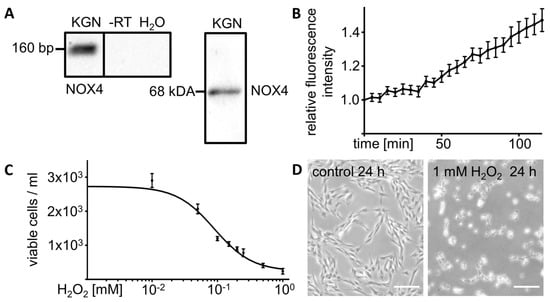 Expression of NOX4, an enzyme known to generate H2O2, was detected by Western blot (68 kDa) and RT-PCR (160 bp) (Figure 1A). The Amplex Red Hydrogen Peroxide Assay (n = 6) provided evidence for basal H2O2 production and release by untreated KGN cells, resulting in increasing levels in the supernatant over time (Figure 1B).