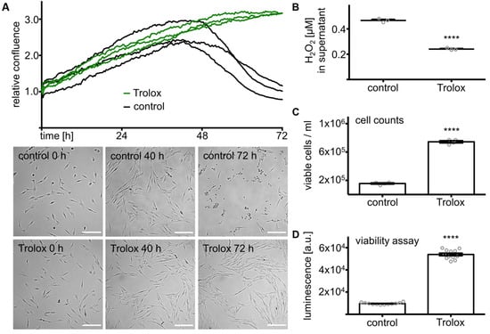 Culturing KGN cells in serum-free medium for 72 h led to a drop in confluence after an initial 2.6 ± 0.2 fold increase for the first 40 h (mean). This decrease was prevented by the addition of Trolox (20 µM), a water-soluble derivate of vitamin E. Trolox is well known for its antioxidative activity [,] and kept KGN cells prospering until the end of the measurement. Pictures taken by a live cell imaging system show the difference between treated and control cells. While KGN cells looked healthy within the first part of the observation under both conditions, they detached after 72 h under control conditions, but were further propagated with Trolox (Figure 2A). The H2O2 concentration in the supernatant of KGN cells after 72 h in serum-free medium was significantly (n = 3, p < 0.0001, t-test) reduced by Trolox (Figure 2B). Cell counts (n = 4, p < 0.0001, t-test) (Figure 2C) and viability assay (n = 12, p < 0.0001, t-test) (Figure 2D) after 72 h gave further evidence for the positive effects of Trolox on KGN cell survival in serum-free medium.