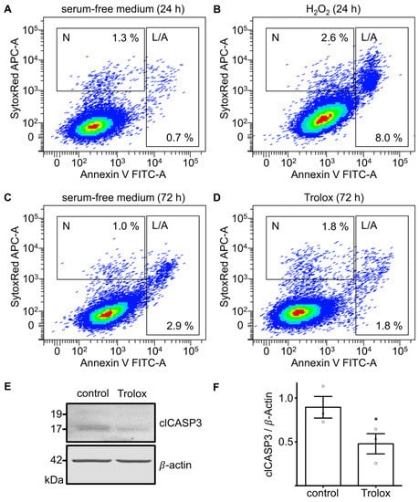 Addition of Trolox (20 µM) to the serum-free medium reduced the L/A fraction after 72 h in serum-free medium by 37.9% (Figure 3C,D), but not the N fraction, which actually increased. Western blot analysis confirmed the effect on apoptosis by showing a significant reduction in clCASP3 (n = 3, p = 0.0225, paired t-test) (Figure 3E,F).
