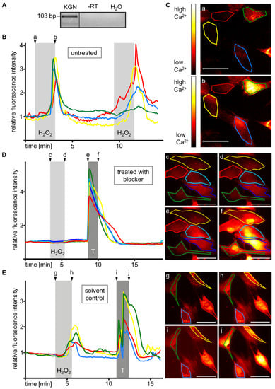 Expression of TRPM2 channel, a H2O2-responsive Ca2+-permeable cation channel, was detected by RT-PCR (Figure 4A) and sequencing. To examine functionality of TRPM2, changes in intracellular Ca2+ levels were imaged. Stimulation with H2O2 (1 mM) caused a transient increase in Ca2+ levels in three independent measurements, which occurred with a delay of more than 1 min and quickly disappeared after terminating the stimulation. Repeated stimulation was possible (Figure 4B,C). The Ca2+ increase was blocked by treatment with the TRPM2 inhibitor ACA (20 µM) [,,] applied for 4 h prior to and during the measurement. Cellular response to the positive control (trypsin) was not affected (Figure 4D). The H2O2-derived signal was obtained in the control experiments with the solvent (Figure 4E). Videos are provided in the Supplementary Materials (Videos S1–S3). Blocking experiments and according controls were repeated in four independent measurements each.