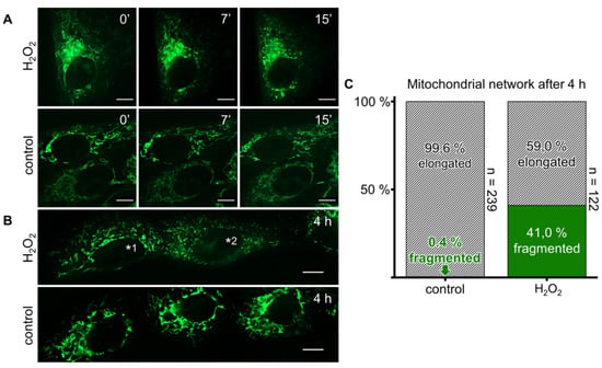 H2O2 causes mitochondrial fragmentation. (A) MitoTracker Green FM-based live cell fluorescence images show mitochondria of KGN cells treated with H2O2 (100 µM) at different time points, compared to medium-only controls. (B) KGN cells stained and imaged after 4 h of treatment with H2O2 (100 µM) or medium only. *1 indicates a cell presenting an elongated mitochondrial network, *2 indicates an example of a fragmented mitochondrion. (C) Portion of cells with fragmented mitochondria after 4 h, as determined by counting 239 control and 122 treated KGN cells. Mitochondrial fragmentation was markedly increased in H2O2-treated cells. Scale bars (A,B) indicate 10 µm.
