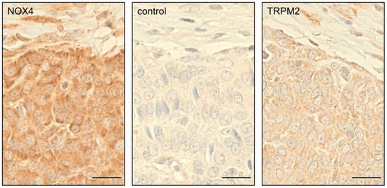 Immunohistochemistry was performed using TMAs assembled from anonymized archival material. All patients were treated surgically at the same institution (Department of Gynaecology, University of Munich, Germany) and diagnosed at the Institute for Pathology, LMU, Munich, Germany. The diagnoses were confirmed by an experienced gynaecopathologist (D.M.). Tissue biopsies (n = 73) were taken from representative regions of larger paraffin-embedded tumor samples and arrayed into a new recipient paraffin block using MTA-1 (Manual Tissue Arrayer) from Beecher Instruments, Sun Prairie, WI, USA. Staining procedures were conducted as previously described []. In brief, sections were deparaffinized, antigens were unmasked and endogenous peroxidase activity was blocked, followed by incubation in 10% goat serum, diluted in PBS, to prevent unspecific binding. Polyclonal rabbit antisera raised against human NOX4 (1:500, #7927, ProSci, Fort Collins, CO, USA) or against human TRPM2 (1:100, #HPA035260, Sigma-Aldrich) were used to identify these proteins in the TMAs. Specific binding was detected by biotinylated goat anti-rabbit secondary antibody and Vectastain Elite ABC kit (Vector Laboratories, Burlingame, CA, USA). For negative controls, incubation with normal rabbit serum instead of the primary antiserum was performed. Sections were counterstained with haematoxylin and visualized using a Zeiss Axioplan microscope with the Achroplan 63x/0.80 objective (Carl Zeiss Microscopy, Jena, Germany) and a Jenoptik camera (Progres Gryphax Arktur; Jenoptik, Jena, Germany).