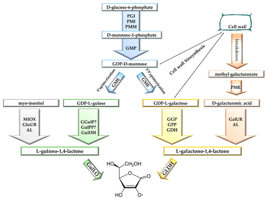 GDP-d-mannose and GDP-l-galactose are substrates for the synthesis of glycoproteins and polysaccharides of cell walls [135,136]. Thus, the first dedicated step for vitamin C synthesis in the d-mannose/l-galactose pathway is the conversion of GDP-l-galactose into l-galactose-1-phosphate, catalyzed by GDP-l-galactose-phosphorylase (GGP) [137].