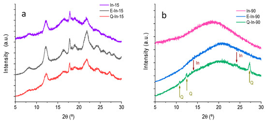 X-ray diffractograms for In-15, E-In-15, and Q-In-15 (a), and for In-90, E-In-90, and Q-In-90 (b).