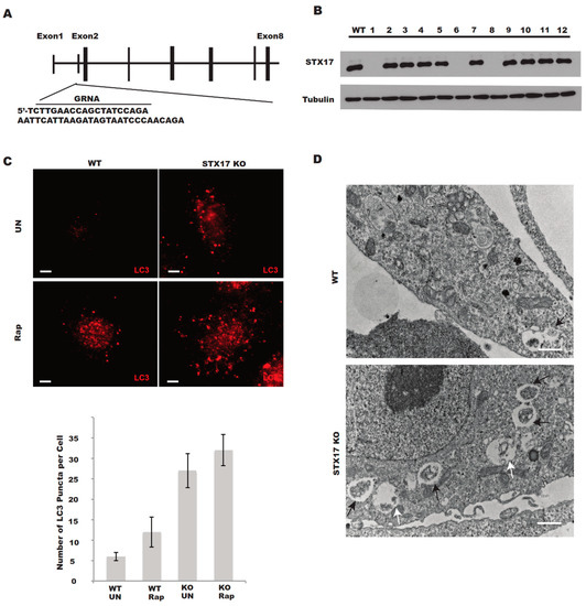 The human osteosarcoma U2OS cell line is frequently used in the study of autophagy due to its relatively normal autophagic response [7,12,13]. We designed a small guide RNA (sgRNA) targeting the sequence within exon 2 of human STX17 (Figure 1A), which should lead to the complete destruction of STX17 genomic DNA and no expression of the STX17 protein. Indeed, we obtained 7 out of 24 clones with no STX17 protein expression and the STX17 expression of 12 clones including 3 STX17 null clones was shown via Western blotting analysis (Figure 1B). Since STX17 was completely knocked out in four of the knockout clones, we picked clone KO1 for the following functional analysis. We examined the autophagosome formation and accumulation in the STX17 knockout (KO) cells. LC3 puncta shown by immunostaining were significantly increased in STX17 KO cells (Figure 1C) and the majority of the autophagic membrane structures were sealed double-membrane autophagosomes with undigested cellular contents (Figure 1D). However, single-membrane autolysosome vesicles could also be observed in STX17 KO cell lines (Figure 1D). This suggests the accumulation of autophagic vacuoles in the STX17 KO cells.