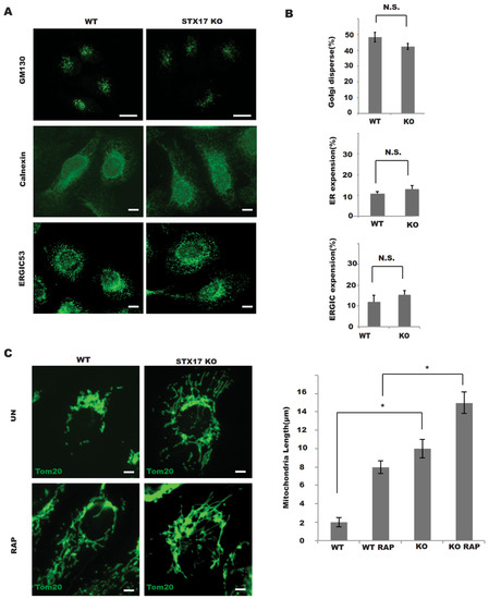 Given that STX17 is implicated in the dynamics of various organelles, including the ER, Golgi and mitochondria [4,10], we examined the effects of STX17 on organelle dynamics in STX17 KO cells. In the absence of STX17, the Golgi apparatus labeled by GM130 was largely unchanged compared to those in wild-type cells (Figure 4A,B). Also, there was no obvious difference in ER morphology labeled by Calnexin or in ERGIC morphology labeled by ERGIC53 (Figure 4A,B) in STX17 KO cells or wild-type cells. One striking difference between STX17 KO and wild-type cells was in the shape of mitochondria. The length of mitochondrial tubules was significantly increased in the STX17 KO cells (Figure 4C). This observation supported a positive role of STX17 in mitochondrial fission.
