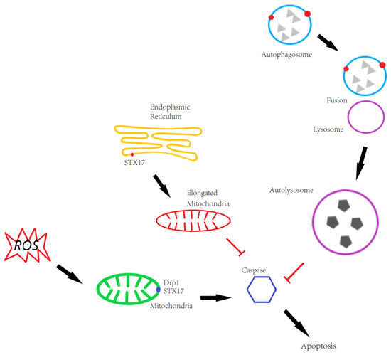 The role of STX17 in regulating apoptosis. On autophagy, STX17 KO blocks autophagosome-lysosome fusion and thus in a way caspase aggregation induces cell apoptosis. On mitochondria, STX17 KO blocks mitochondrial fission and elongated mitochondria provides an additional benefit to escape ROS induced autophagic degradation and thus spares from cell apoptosis.