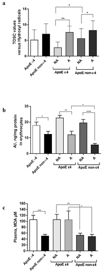 According to these findings, our results showed an inverse correlation between plasma AOC towards hydroxyl radicals and the Aβ erythrocytes levels, and a significant decrease in ApoE ε4 carriers compared to non-ε4 carriers. Moreover, physical activity was confirmed to modulate the antioxidant capability, independently from ApoE polymorphism. Indeed, active subjects showed higher levels of plasma AOC compared to non-active subjects, and plasma AOC showed a significant direct correlation with the level of physical activity, as previously reported in human subjects [13,17,52].