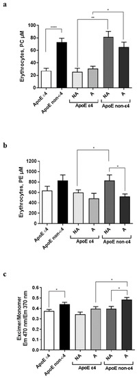 Consistently, comparable levels of erythrocyte PC were found between active and non-active subjects (ε4 group: P = 0.3929; non-ε4 group: P = 0.2475). Globally, these data demonstrate that PC levels are dependent on ApoE polymorphism, but not on physical activity.