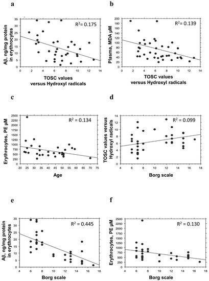 Correlation between plasma and erythrocytes well-being parameters. Correlation analysis between erythrocytes Aβ (a) or lipid peroxidation (b) and plasma AOC. (c) Correlation analysis between PE and age. Correlation analysis between plasma AOC (d), Aβ (e), or PE concentration (f) and Borg scale. Correlation between variables was determined by simple linear regression analysis, using the StatView program (Abacus Concepts, Inc., SAS Institute, Cary, NC). P and R2 values obtained for each correlation are reported in the respective panel.