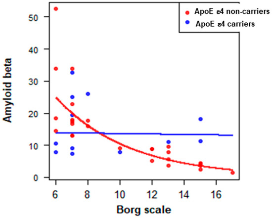 Interestingly, multiple regression analysis confirmed that the decrease in erythrocytes Aβ levels in non-ε4 carriers was strictly dependent on the level of physical activity. In contrast, the decrease in Aβ concentration was completely independent of the level of physical activity in non-ε4 carriers. Similarly, the benefits of a physical activity-induced decrease in plasma Aβ amount have been shown to be received by non-ε4 carriers only [50]. Of note, the effect observed in non-ε4 carriers is related to moderate physical exercise, because extreme physical exercise has an opposite effect, even in the liver, due to damage of erythrocytes, which may cause a Fenton-type reaction as an effect of the release of free iron from erythrocytes [51].