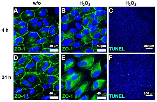 ARPE-19 cells reduced tight junctions and circumvented apoptosis under oxidative stress. (A,D) ARPE-19 cells untreated (without (w/o)) and stressed with H2O2 for (B,C) 4 h or (E,F) 24 h translocated the zonula occludens protein 1 (ZO-1, green) time-dependently from the (A,D) cell membrane to the (B,E) cytoplasm. (C,F) ARPE-19 cells treated with oxidative stress showed a minimal TUNEL-positive (light blue) apoptotic reaction after (F) 24 h.