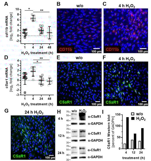 Oxidative stress increased the expression of complement receptor subunit CD11b and C5aR1 in ARPE-19 cells. (A) Cd11b mRNA expression was increased 4 h after H2O2 treatment. This effect was confirmed on a protein level by immunohistochemistry using (B,C) anti-CD11b (red) antibodies. (D) C5ar1 mRNA also increased on (D) mRNA and (E–G) protein level (anti-C5aR1, green) in H2O2 treated cells. (H) Western blots of ARPE-19 cell lysates detected C5aR1 between 40 and 60 kDa after 4–24 h H2O2 treatment (full immunoblots are shown in the Supplementary Materials, Figure S3A,B; n = 1) (I) Quantitatively, C5aR1 expression was increased in H2O2-treated cells in the Western blots. (A,D) Mean with standard deviation is shown, * p ≤ 0.05, ** p ≤ 0.01. The dotted line depicts the untreated control; (B,E,H,I) w/o untreated control.