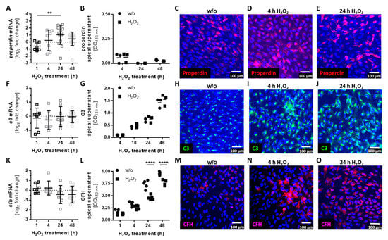 Oxidative stress induced complement component accumulation in ARPE-19 cells. (A) Properdin mRNA levels were increased 24 h following H2O2 treatment. This did not affect (B) apical properdin secretion, but was confirmed in the protein level by immunohistochemistry using an (C–E) anti-properdin (red) antibody. (F) C3 mRNA and (G) apical C3 protein secretion were not altered in stressed ARPE-19 cells. Immunohistochemistry using (H–J) anti-C3 (green) antibodies showed an increase of cell-associated (I,J) C3 after oxidative stress treatment. (K) Cfh mRNA and (L) CFH apical protein concentration were decreased following H2O2 treatment. (M–O) Immunohistochemistry using anti-complement factor H (CFH, purple) antibodies showed an increase in cell-associated (N,O) CFH after oxidative stress treatment. Mean with standard deviation is shown, ** p ≤ 0.01, **** p ≤ 0.0001; dotted line depicts untreated control (A,F,K); w/o untreated control (G,G,L); ELISA control standard curves and protein concentrations in the basal supernatants are shown in the Supplementary Materials, Figure S4D–I.
