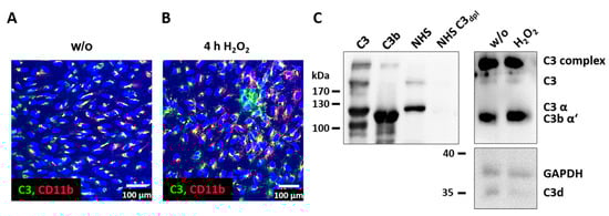C3 and complement receptor CD11b were colocalized in ARPE-19. (A) Unstressed (w/o) and (B) H2O2-treated ARPE-19 cells were stained with anti-C3 (green) and anti-CD11b (red) antibodies. Overlapping staining signals (yellow) suggested a colocalization of C3 and CD11b. (C) C3 and activation products (C3b α’ and C3d) were detected in untreated and H2O2-treated ARPE-19 cells using a Western blot under reducing conditions (controls: native C3, C3b, human serum (NHS), and C3-depleted human serum (NHS C3dpl)). Full immunoblots are shown in the Supplementary Materials, Figure S3C,D; immunoblots were repeated twice.