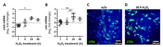 The expression of intracellular proteases was increased by oxidative stress in ARPE-19. (A) Ctsb and (B) ctsl mRNA expression increased 24 h after H2O2 treatment. This effect was confirmed on the protein level in immunostainings using an (C,D) anti-CTSL (green) antibody. (A,B) Mean with standard deviation is shown, * p ≤ 0.05, ** p ≤ 0.01, dotted line depicts untreated control; (C) w/o untreated control.