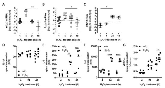 Increased nlrp3 and foxp3 mRNA expression correlated with proinflammatory and proangiogenic factor secretion. (A) Nlrp3, (B) foxp3, and (C) il1β mRNA levels increased either (A,B) 4 h or (C) 24 h and 48 h following H2O2 treatment. The proinflammatory cytokine release of (D) Interleukin (IL)-1β and (E) IL-6 was detected in stressed ARPE-19 cells. This was correlated with an enhanced secretion of the proangiogenic factors (F) IL-8 and (G) vascular endothelial growth factor (VEGF)-α in H2O2-treated cells. MFI: mean fluorescence intensity. Mean with standard deviation is shown, * p ≤ 0.05, ** p ≤ 0.01, *** p ≤ 0.001, **** p ≤ 0.0001; (A,B,C) dotted line depicts untreated control; (D–G) w/o untreated control; protein concentrations in the basal supernatants are shown in the Supplementary Materials, Figure S4J–L.