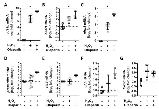 Olaparib enhanced oxidative stress-dependent expression changes in ARPE-19 cells. ARPE-19 cells were treated for 4 h with H2O2, and the effect of simultaneously added olaparib on transcription was investigated. (A) Cd11b, (B) c5aR1, and (C) nlrp3 transcripts were significantly increased in olaparib-treated, stressed cells compared to unstressed cells. Olaparib also increased the expression of (D) properdin, (E) ctsb, and (F) cfd. (G) Foxp3 mRNA levels were not changed in stressed ARPE-19 cells following olaparib addition. Mean with standard deviation is shown, * p ≤ 0.05; dotted line depicts untreated control.