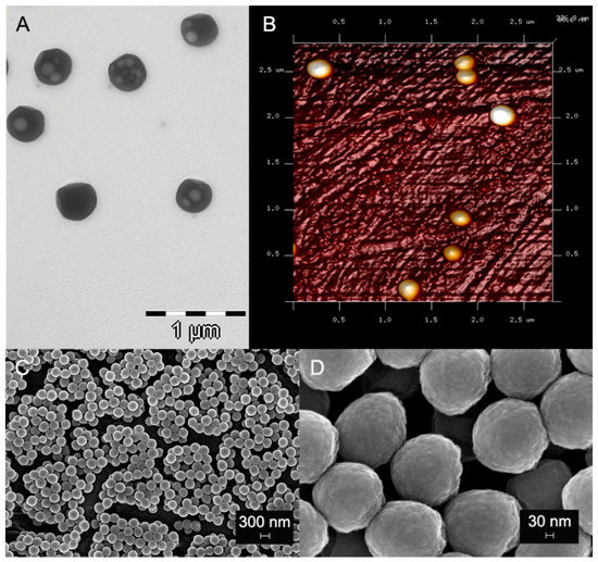 The obtained images are displayed in Figure 1. Figure 1A presents TEM images, Figure 1B displayed AFM pictures and Figure 1C,D shows NPs observed under the FESEM. NPs did not agglomerate, and presented a spherical and homogeneous shape. They are non-porous NPs. Light circular objects inside of the NPs in TEM images (Figure 1A) were artifacts developed during electron beam transmission.