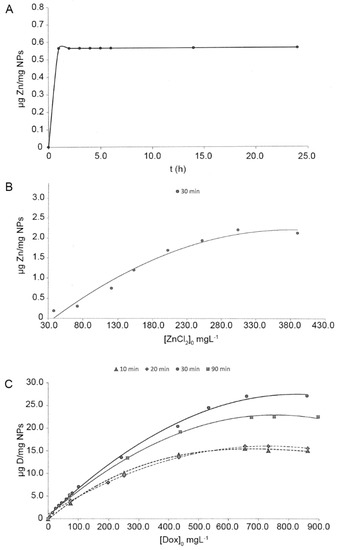 The attained absorption equilibrium of zinc as a time function and ZnCl2 solution concentrations is shown in Figure 2A,B. The maximum zinc complexation value (2 µg Zn/mg NPs) was attained after the NPs’ immersion in ZnCl2 solution, at a concentration of 300 mg L−1, for 90 min. Doxycycline doping values for NPs are displayed in Figure 2C. The maximum doxycycline adsorption value was achieved after 30 min of NP incubation, which corresponded to 27.1 µg Dox/mg NPs using a solution of doxycycline hyclate at a concentration of 750 mg L−1.