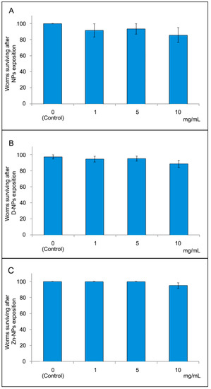 Lethal toxicity expressed as a percentage of surviving worms, after the nematodes were exposed to different nanoparticles and concentrations. Results are presented as mean and standard error of three different assays (A–C). Each independent assay included three NGM plates with ten worms in each one. A total of 90 worms were then tested for each experimental group. No differences in worm surviving percentages were found after ANOVA analysis (p > 0.05). D-NPs: doxycycline-doped nanoparticles. NPs: undoped nanoparticles. Zn-NPs: zinc-doped nanoparticles.