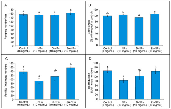 Mean and standard error of pharyngeal pumping (A), body length (B), fertility (C) and reproduction (D) of Caenorhabditis elegans exposed to different NPs, at 10 mg/mL concentration. One-way ANOVA was not significant for pharyngeal pumping (p > 0.05). ANOVA tests were significant for body length, fertility and reproduction (p < 0.05). For each graph, similar letters (a,b) indicate no significant differences between the NPs experimental groups, after Bonferroni post hoc testing at p < 0.05. D-NPs: doxycycline-doped nanoparticles. NPs: undoped nanoparticles. Zn-NPs: zinc-doped nanoparticles.