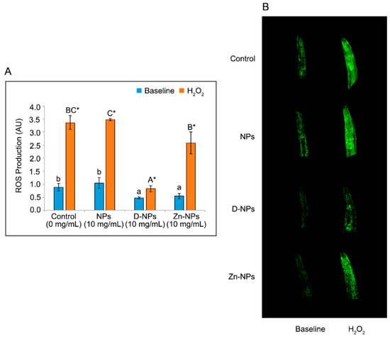 Intracellular hydrogen peroxide production, expressed as the ratio of in oxidized/reduced Hyper, when Caenorhabditis elegans is exposed to the different nanoparticles at 10 mg/mL concentration. Results are presented as mean and standard error. Different lowercase letters (a,b) indicate significant differences (p < 0.05) between the distinct experimental groups at base line. Different capital letters (A–C) represent the existence of significant difference (p < 0.05) between the experimental groups induced with 20 mM of hydrogen peroxide. The asterisk (*) represents the existence of statistically significant differences (p < 0.05) between the baseline and the induced with hydrogen peroxide levels within the same experimental group (A). Confocal microscopy images (5×) representing worm’s fluorescence at same dosages of NPs and H2O2 as for Figure 5A D-NPs: doxycycline-doped nanoparticles. NPs: undoped nanoparticles. Zn-NPs: zinc-doped nanoparticles (B).