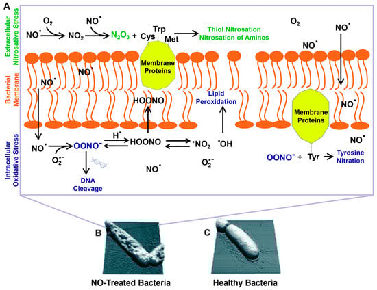 The multiple antimicrobial mechanisms of NO and its byproducts (A). Bacteria on NO releasing surfaces (B) and on controlled surfaces (C). Reproduced with permission from [47]. Copyright 2012, Royal Society of Chemistry.