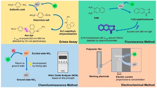 Since the antibacterial ability of NO is dose-dependent, the release behavior of NO releasing polymeric materials should be the primary issue in the following researches once the materials are prepared. For example, the amount of NO release should be adequate to kill bacteria, and the release time of NO should be carefully detected when long-term application is required. Furthermore, a real-time detection of NO release is needed when we evaluate the light-responsive property of photo-triggered NO releasing polymers and their stability without light irradiation. Therefore, an appropriate method for detecting NO release is a key factor in the research of NO releasing antibacterial polymeric materials. Additionally, different NO detecting methods have different sensitivity and detection limits, which are suitable for different conditions. Herein, we introduce four commonly used methods for NO detection (Figure 2), focusing on their detecting mechanism, advantages, application conditions, and limits in antibacterial researches.