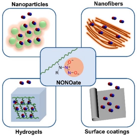NONOate conjugated polymeric materials for antibacterial application: NO releasing hydrogels, reported in [95]; NO releasing nanoparticles, reported in [56,96,97]; NO releasing nanofibers, reported in [98]; NO releasing surface coatings, reported in [99,100,101,102].