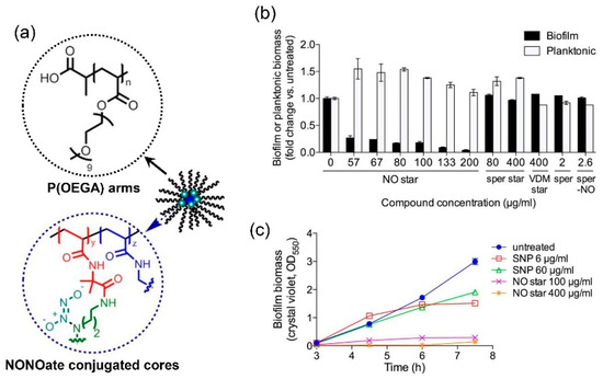 Polymer-based nanoparticles containing NONOate functional groups are extensively researched recently and have been proven to possess significant antibacterial and antibiofilm efficiency. Boyer et al. reported for the first time the use of star polymer for the encapsulation of NONOates [56] (Figure 4). They prepared a core cross-linked star polymer containing poly(oligoethylene methoxy acrylate) (P(OEGA)) arms and a cross-linked core, and encapsulated NONOate groups in the hydrophobic core of the star. This star polymer showed a rapid release of NO in the first hour and a sustained NO release in the following 70 h at pH 7.0, and cumulative release of NO was 60 μM when the concentration of star polymer was 1 mg/mL. This star polymer demonstrated great efficacy in preventing biofilm formation of P. aeruginosa with about 90% decrease of biofilm biomass when treated with 100 μg/mL NO star polymer and enhancing the dispersal of biofilms via a nontoxic mechanism over time and confine bacterial growth in a planktonic state.