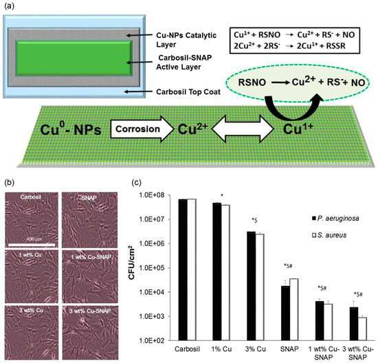 Structure, NO releasing mechanism, noncytotoxicity, reduced platelet adhesion, and bacterial inhibition of Cu-SNAP films. (a) Representative schematic of the polymeric composites with SNAP and Cu-NPs coating and the mechanism of NO releasling from SNAP and Cu-NP coating. (b) Optical images of 3T3 fibroblast cells after 24 h leachate treatment. (c) Inhibition of viable gram-negative (P. aeruginosa) and gram-positive (S. aureus) bacteria strains on the SNAP and Cu-NPs coating surface, in which *, $, and # indicate significant difference in CFU/cm2 of both bacteria compared to that of control, 1 wt % Cu, and 3 wt % Cu-Carbosil composites, respectively. Reproduced with permission from [116]. Copyright 2017, American Chemical Society.