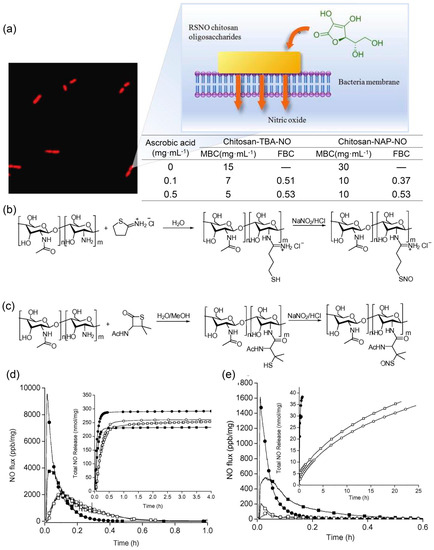 - Lu, Y.; Shah, A.; Hunter, R.A.; Soto, R.J.; Schoenfisch, M.H. S-Nitrosothiol-modified nitric oxide-releasing chitosan oligosaccharides as antibacterial agents. Acta Biomater. 2015, 12, 62–69. [Google Scholar] [CrossRef]