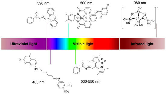 Chemical structures of small molecule photoresponsive NO donors triggered by visible light or near-infrared light.