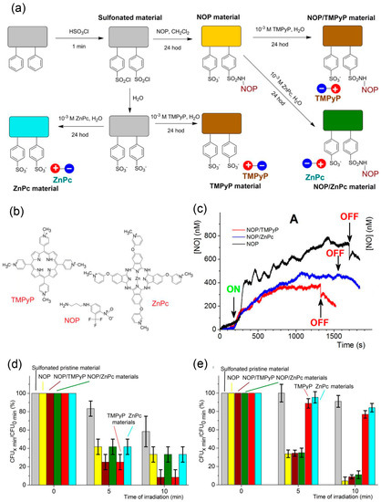 Preparation, NO releasing behavior, and antibacterial properties of photoactive nanofiber materials. (a) Schematic diagram of the preparation protocol for the photoactive nanofiber materials. (b) Structures of the photoactive compounds used in this work: NO photodonor (NOP), tetracationic TMPyP, and tetracationic ZnPc photosensitizers. (c) Amperometric detection of the NO photoreleased from the surface of NOP (black trace), NOP/TMPyP (red trace), and NOP/ZnPc(blue trace) materials. (d) Surface photoantibacterial activity of NOP, NOP/TMPyP, NOP/ZnPc, TMPyP, and ZnPc materials against E. coli compared with sulfonated pristine nanofiber material. (e) Space photoantibacterial activity of NOP, NOP/TMPyP, NOP/ZnPc, TMPyP, and ZnPc materials against E. coli compared with sulfonated pristine nanofiber material. Reproduced with permission from [59]. Copyright 2015, American Chemical Society.
