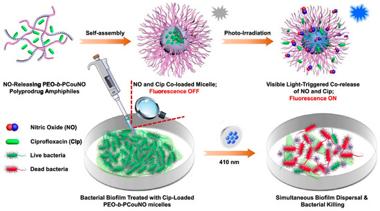 Since biofilm-associated infections pose greater threat to our society, its necessary to develop visible light responsive NO donors capable of combating biofilms. However, there are no reports on 4-nitro-3-(trifluoromethyl)aniline-based NO photoreleaser for antibiofilm application. N-nitrosoamine-based NO donors are also photo-triggered NO donors and several small molecular N-nitrosoamine-based NO donors have been explored [141,142,143,144,145]. More recently, Hu et al. reported a NO releasing micelle bearing visible light responsive NO donors [146]. Unlike the conventional preparation of NO releasing polymers which usually need postmodification approaches, controlled chain length of N-nitrosoamine-based NO releasing monomers were polymerized by utilizing RAFT polymerization with a polyethylene glycol modified chain transfer agent. The resultant amphiphilic polymers were self-assembled into micelles in aqueous solution, which can release NO under 410 nm light irradiation with a remarkable fluorescent report and demonstrated the ability of biofilm dispersal against Pseudomonas aeruginosa. When loading hydrophobic antibiotics, ciprofloxacin (Cip), into the cores, NO and Cip can be released simultaneously under 410 nm light to efficiently eradicate bacterial biofilms and kill bacteria (Figure 9).